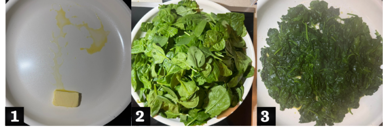 - Melt the butter in a pan over medium heat. (1) Add the spinach (2) and cook until wilted (3). Remove from the heat.