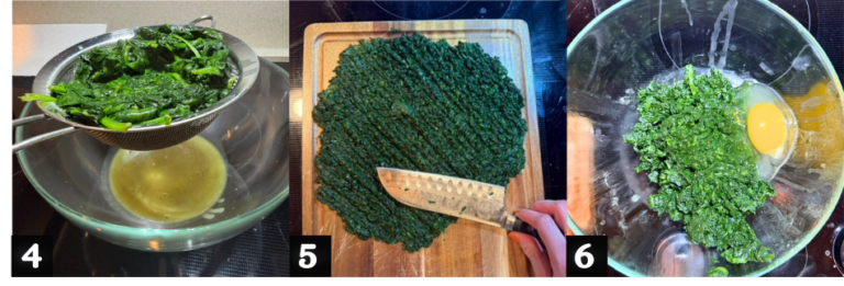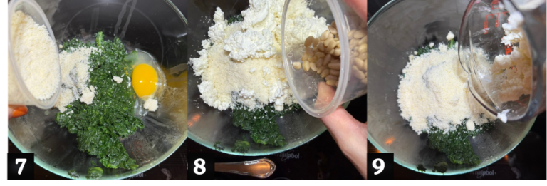 - Once drained, chop the spinach.(5) In a bowl, combine the spinach, ricotta, egg, grated Parmigiano Reggiano, salt, and pine nuts. (6-7-8-9)