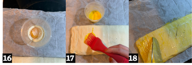 - Fold the edges over the filling or close the pastry, depending on the shape you prefer. (13-14-15). In a small bowl, whisk the egg yolk with the cream (16) and brush it over the pastry. (17).