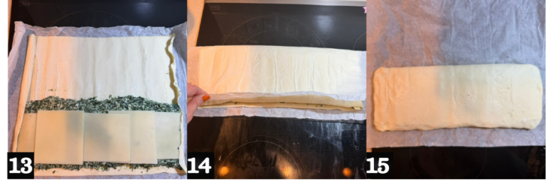 - Spread the spinach and ricotta mixture in the center of the pastry, leaving about a 1-inch border. (11) Arrange the mozzarella slices on top. (12)