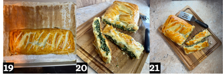 - Move the pastry to a baking sheet and make some cuts on the top. (18). Bake for 25–30 minutes, until the puff pastry is golden and crisp. (19) Let it cool for 5–10 minutes before slicing and serving. (20-21)